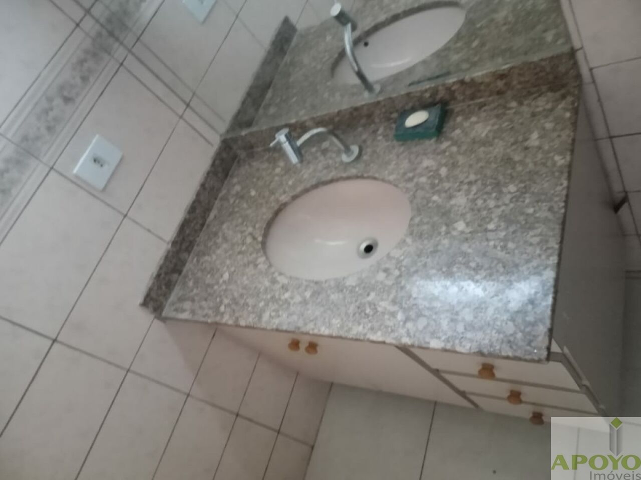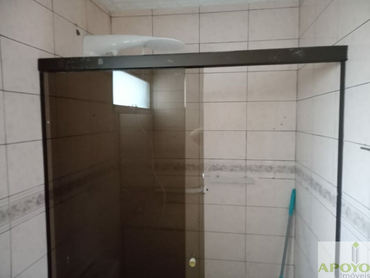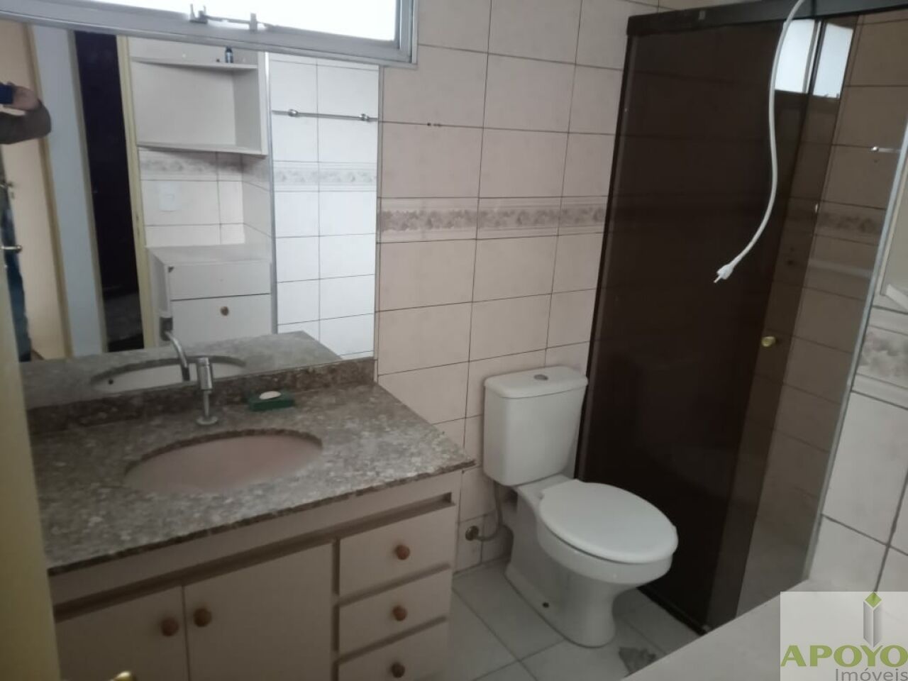 – Banheiro social com box de vidro e pia com gabinete