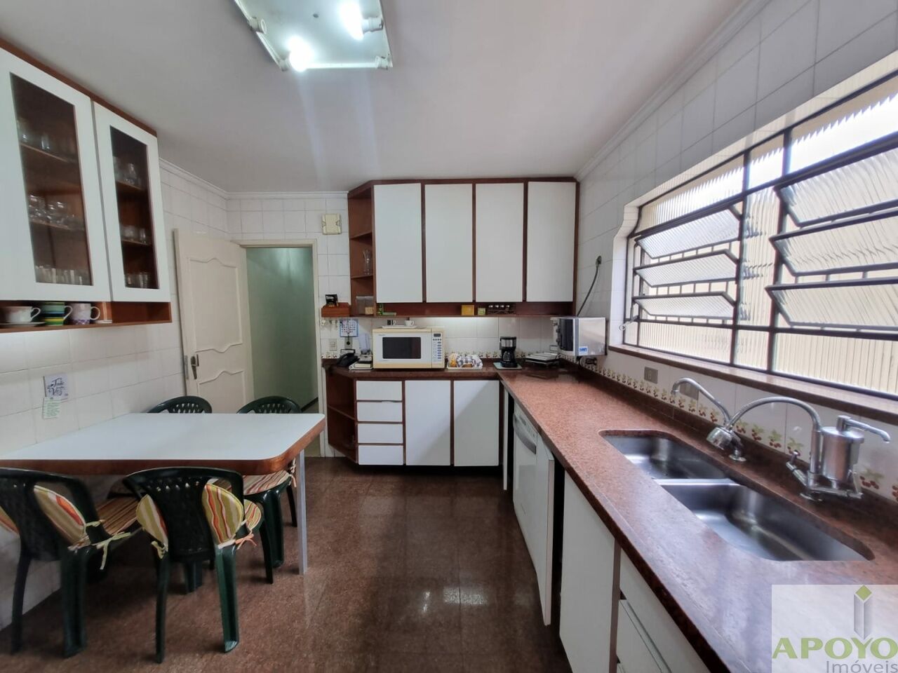 Cozinha ampla, com mesa para 4 lugares, armários planejados, bancada, espaço para geladeira, freezer, máquina de lavar louça e fogão;