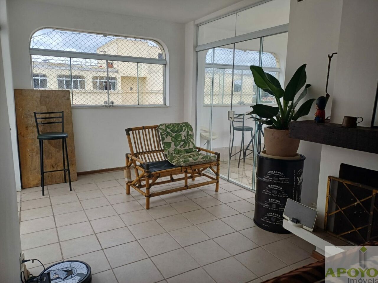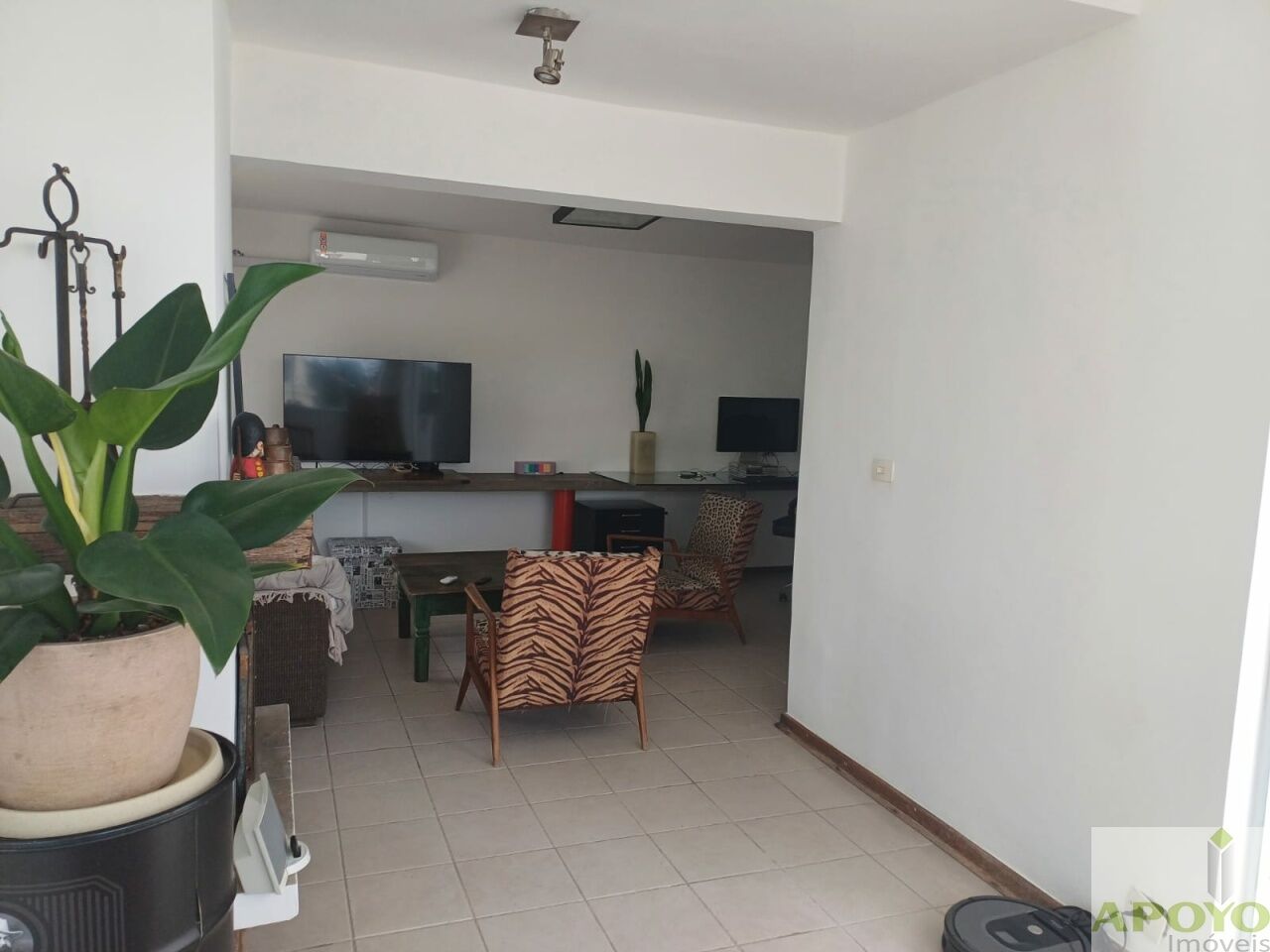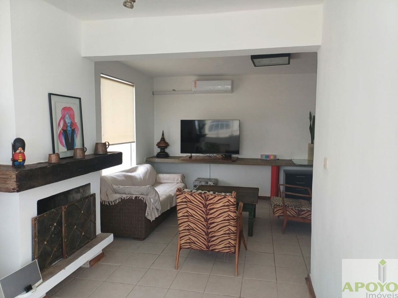 Apartamento com 3 dormitórios com ar condicionado novo, sala para dois ambientes com terraço, cozinha, banheiro social e lavanderia com lavabo na parte de baixo. Parte de cima com sala para dois ambientes com lareira, banheiro social e área externa com churrasqueira e cobertura retrátil – 130m² de área útil. 1 vaga de garagem.