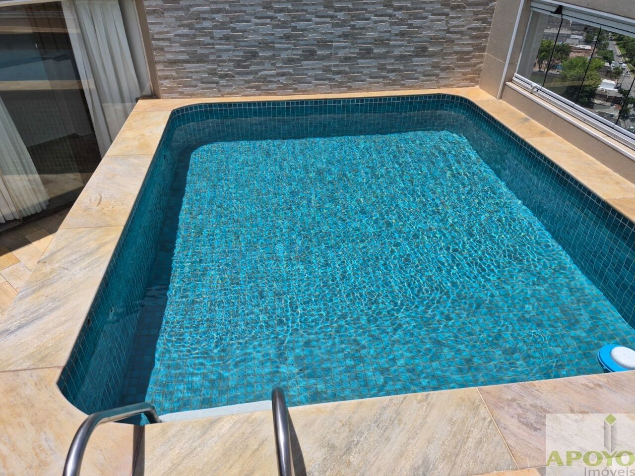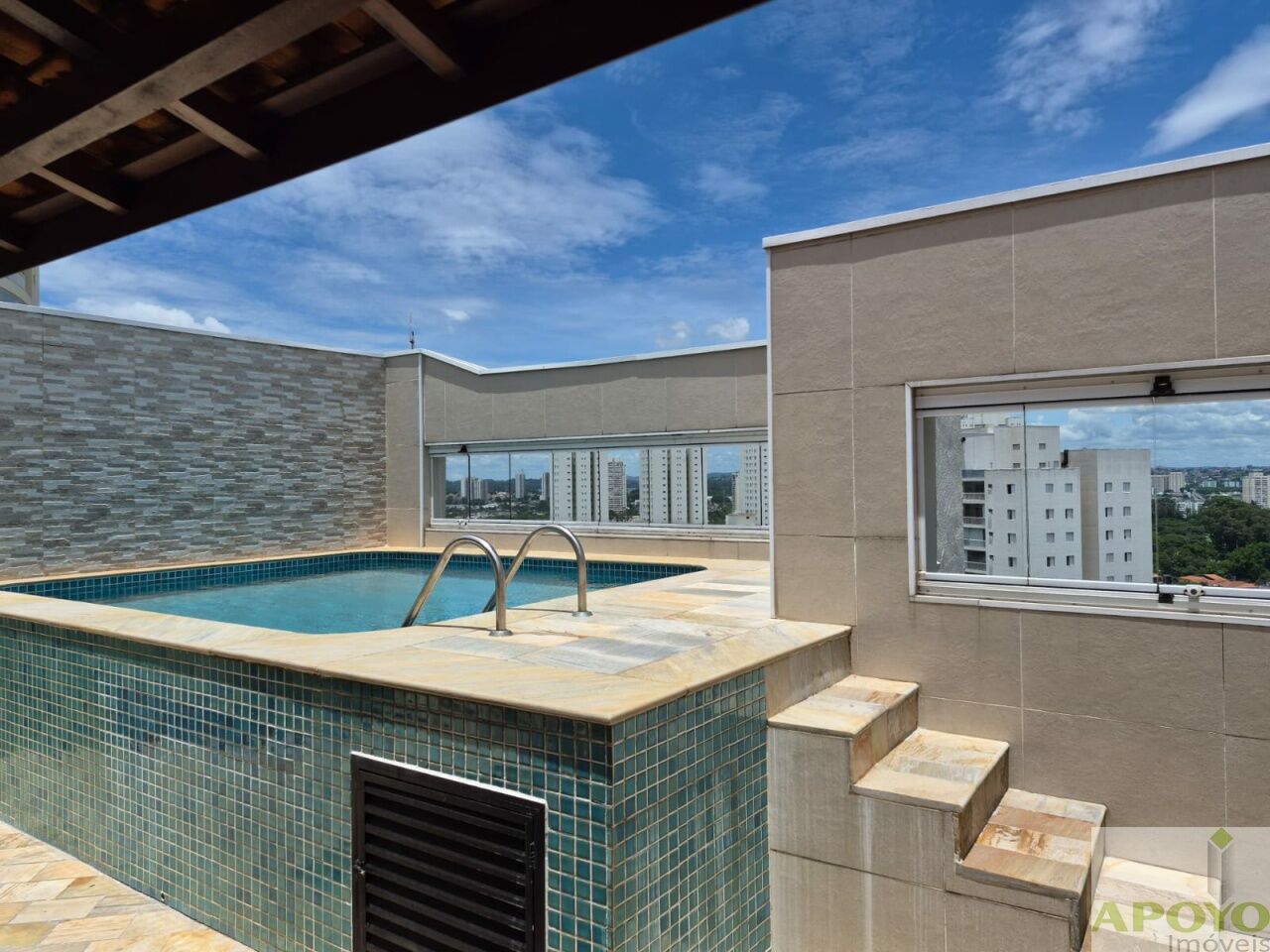 Na parte superior, o acesso é feito por escada em granito, levando a uma excelente área de cobertura com sala de TV, frigobar, churrasqueira, pia em granito com gabinete e piscina, fechada nas laterais com vidro blindex, garantindo conforto e privacidade para momentos de lazer.