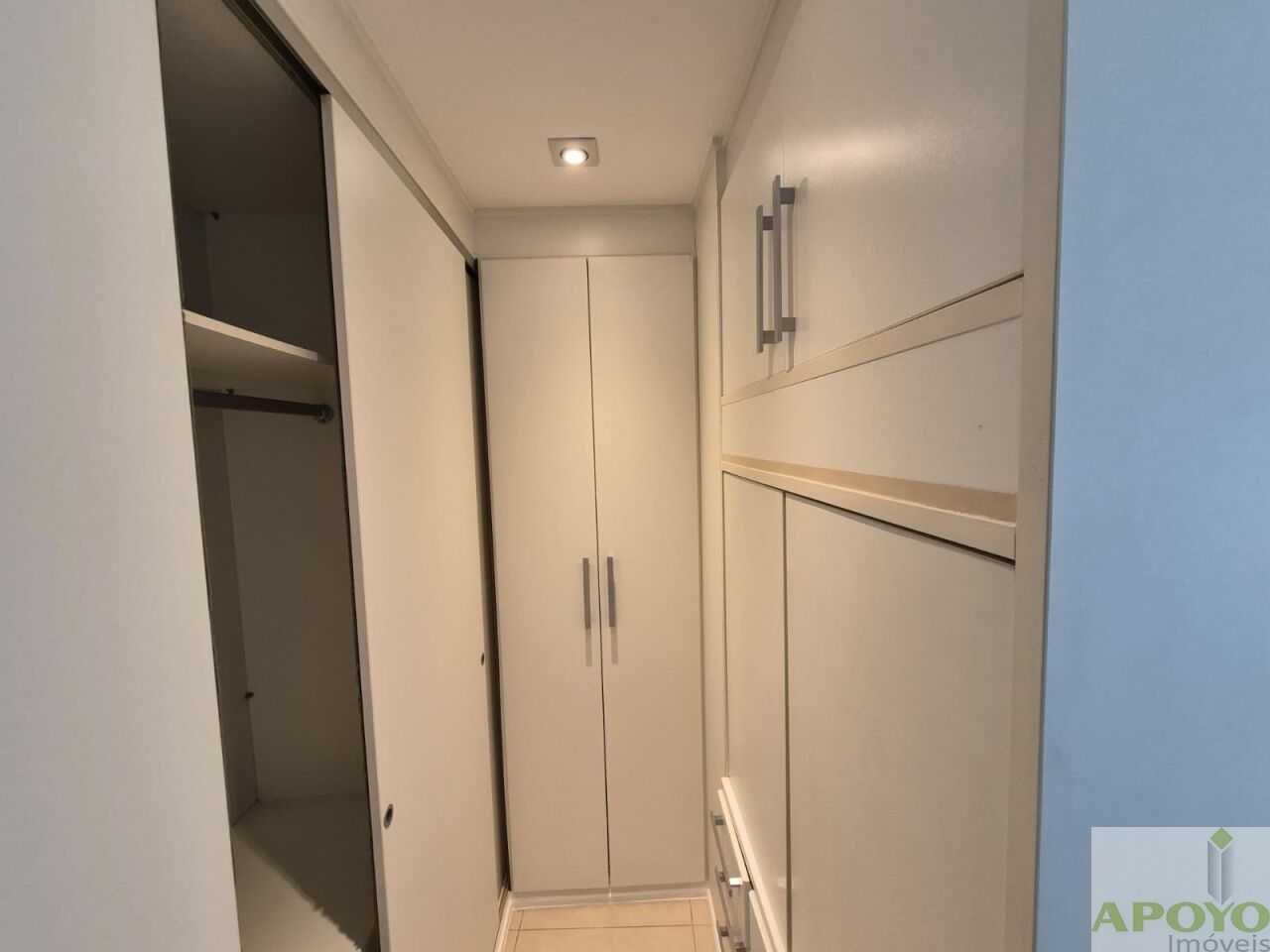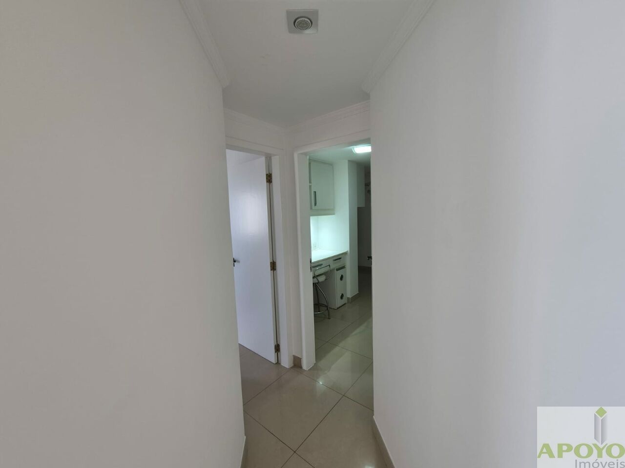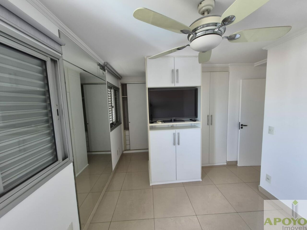 O imóvel é todo em piso porcelanato. No 1º andar, dispõe de sala ampla estendida para a sacada, com iluminação em spots, proporcionando um ambiente sofisticado e bem iluminado. Conta com 2 dormitórios, ambos suítes, sendo uma com closet e a outra adaptada como escritório, ambas equipadas com ventilador de teto.