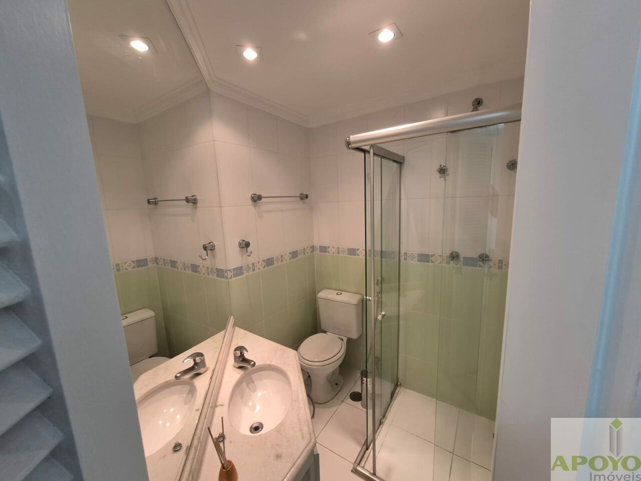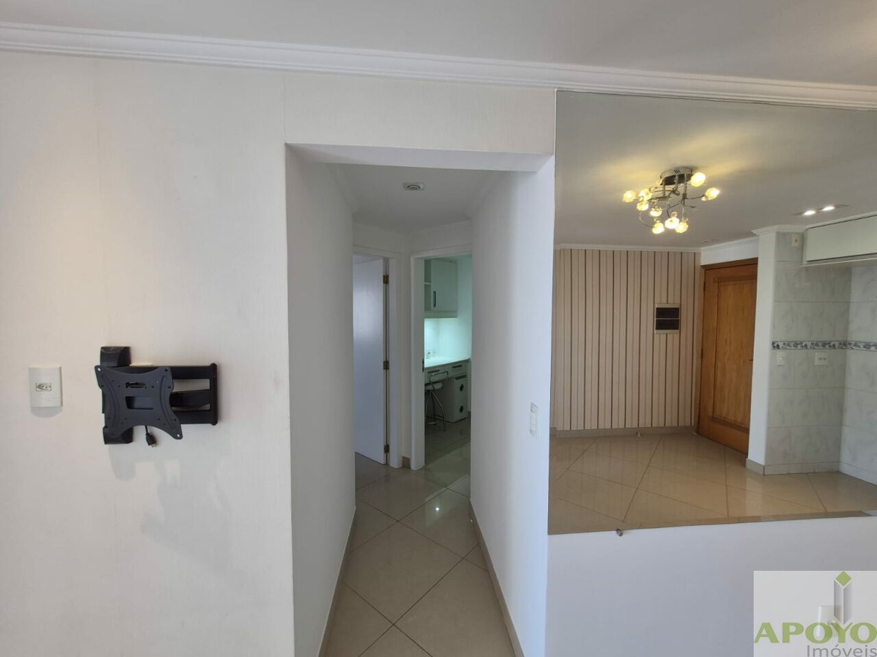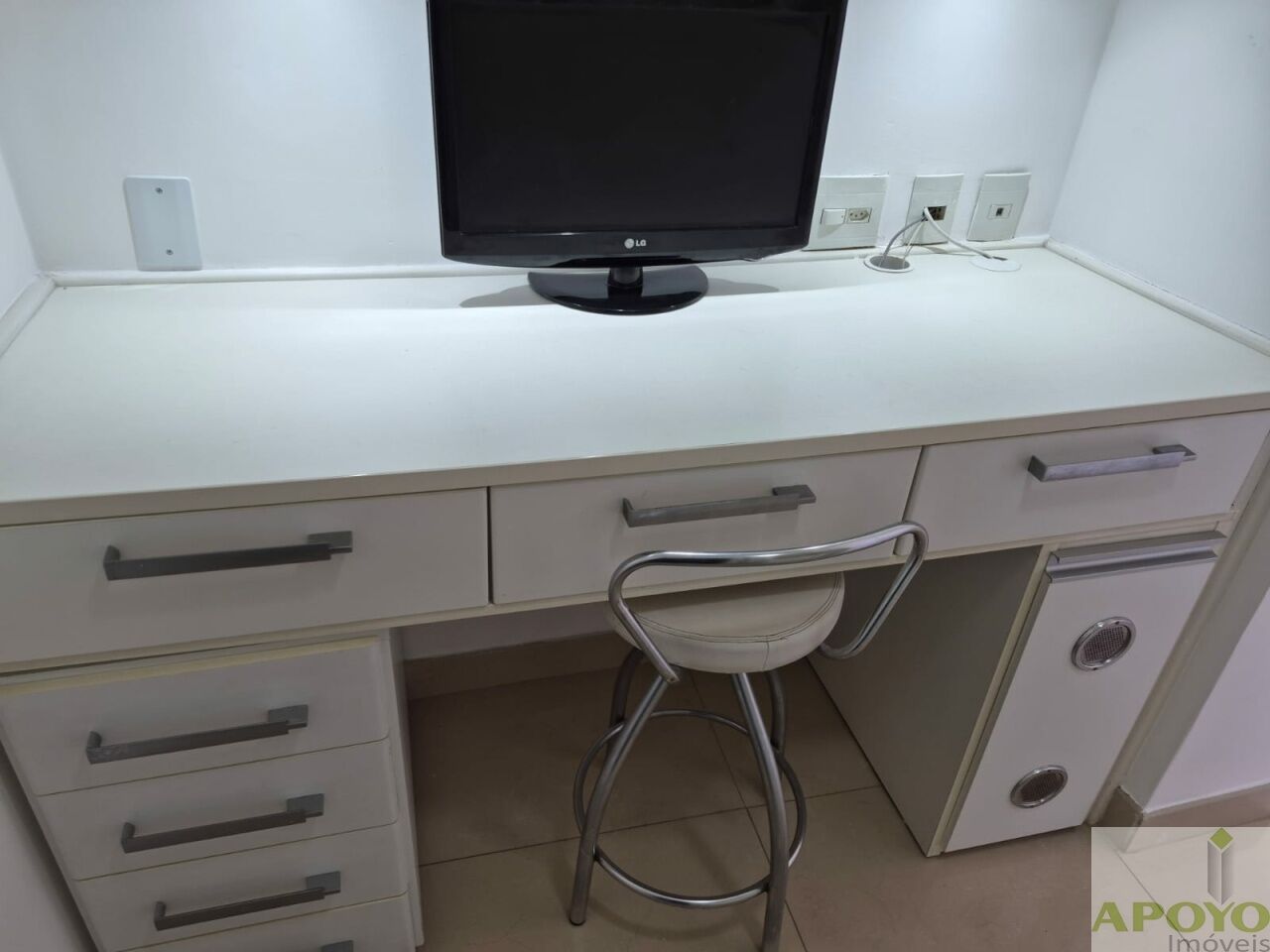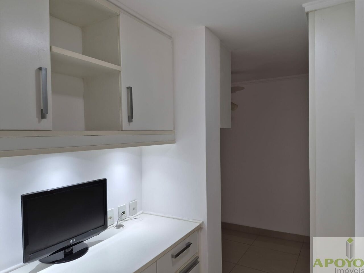 O imóvel é todo em piso porcelanato. No 1º andar, dispõe de sala ampla estendida para a sacada, com iluminação em spots, proporcionando um ambiente sofisticado e bem iluminado. Conta com 2 dormitórios, ambos suítes, sendo uma com closet e a outra adaptada como escritório, ambas equipadas com ventilador de teto.