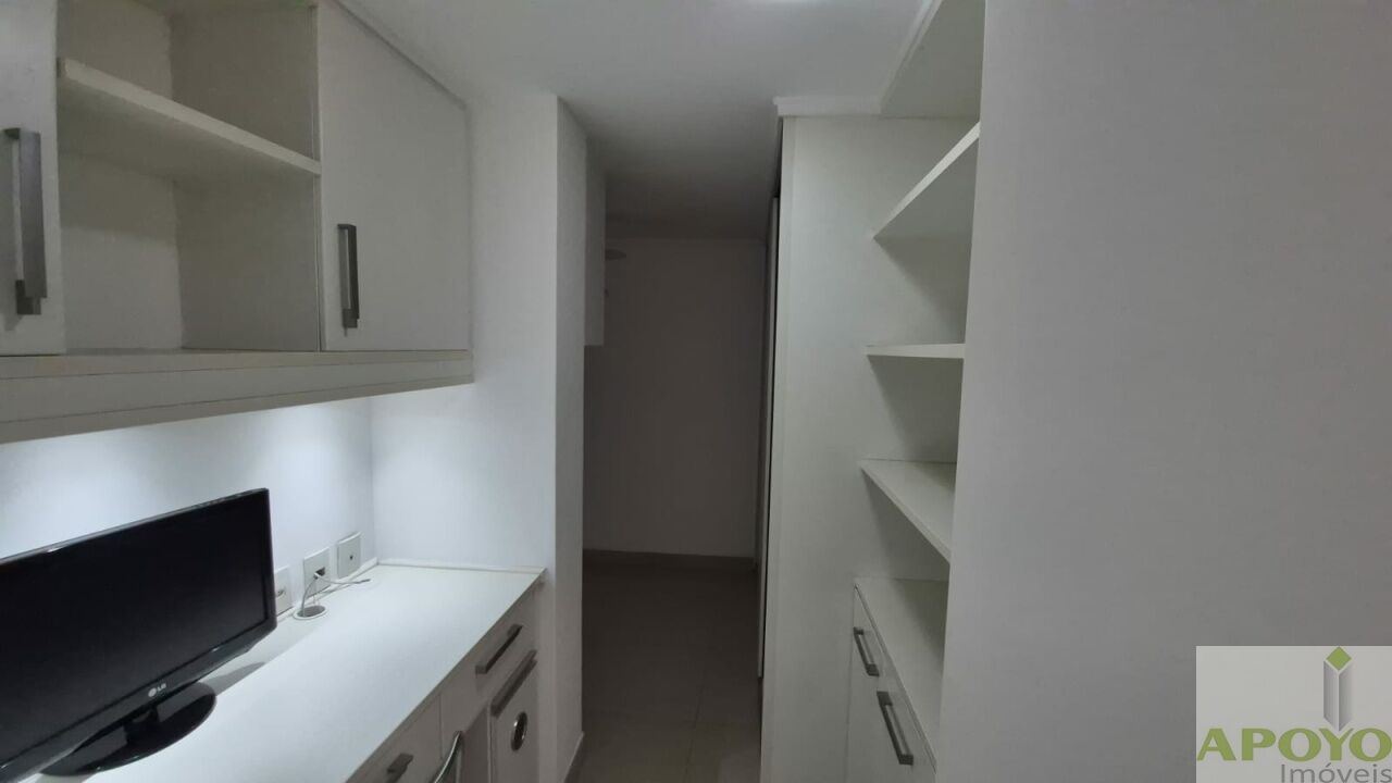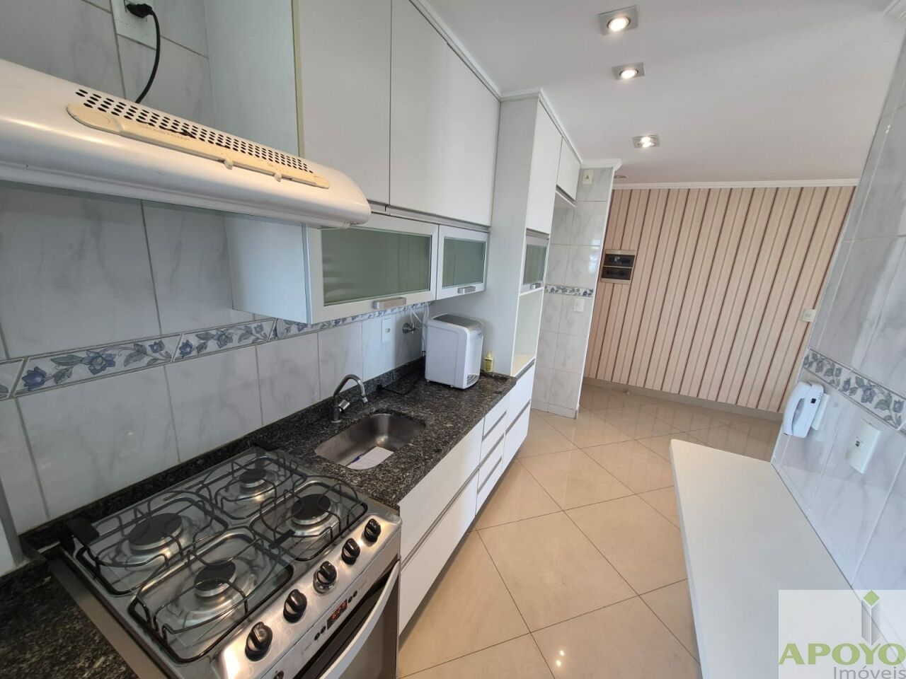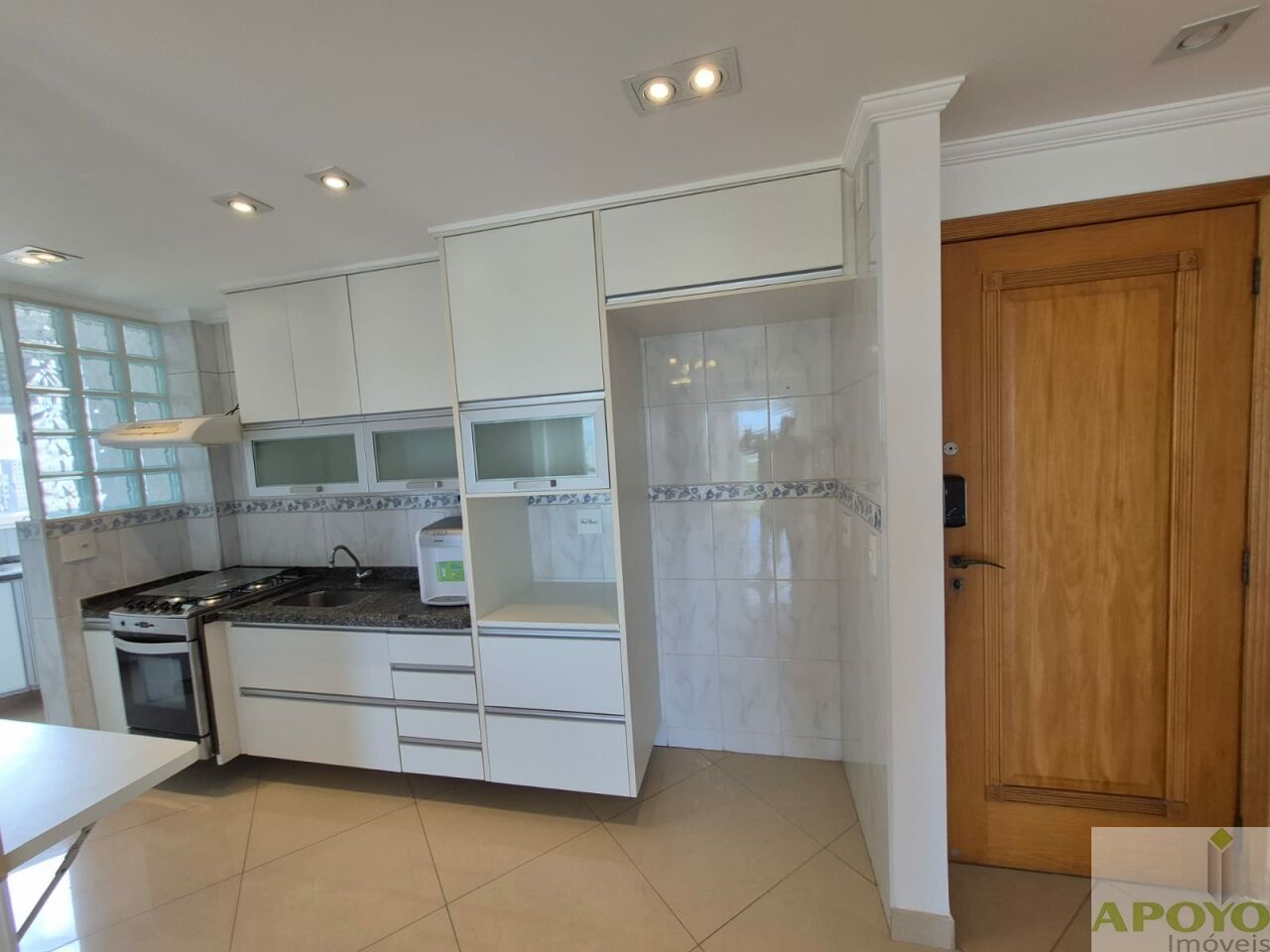 A cozinha é completa em armários, equipada com fogão e exaustor, além de área de serviço com armário e aquecedor.