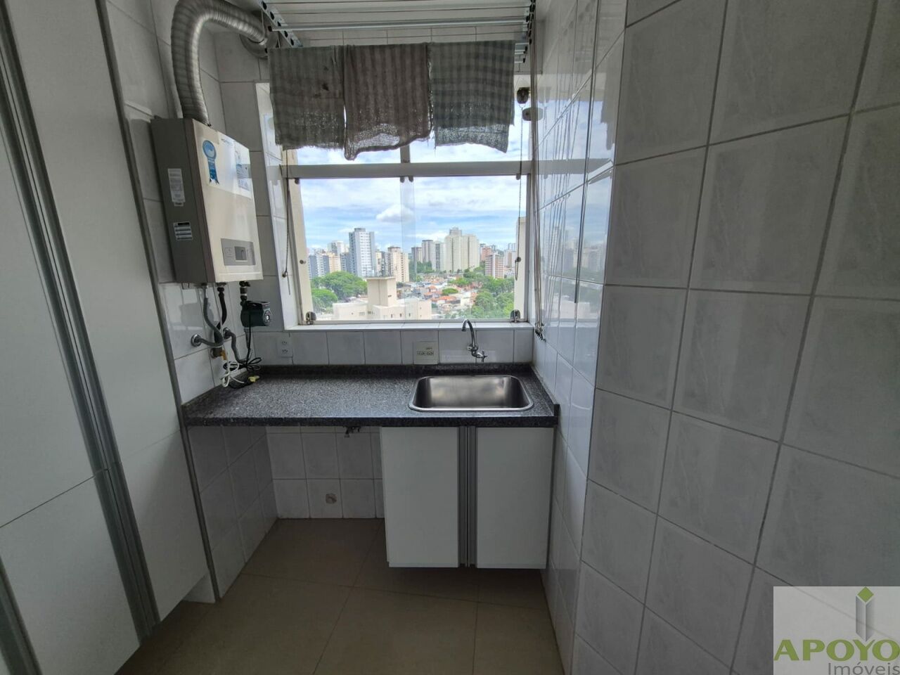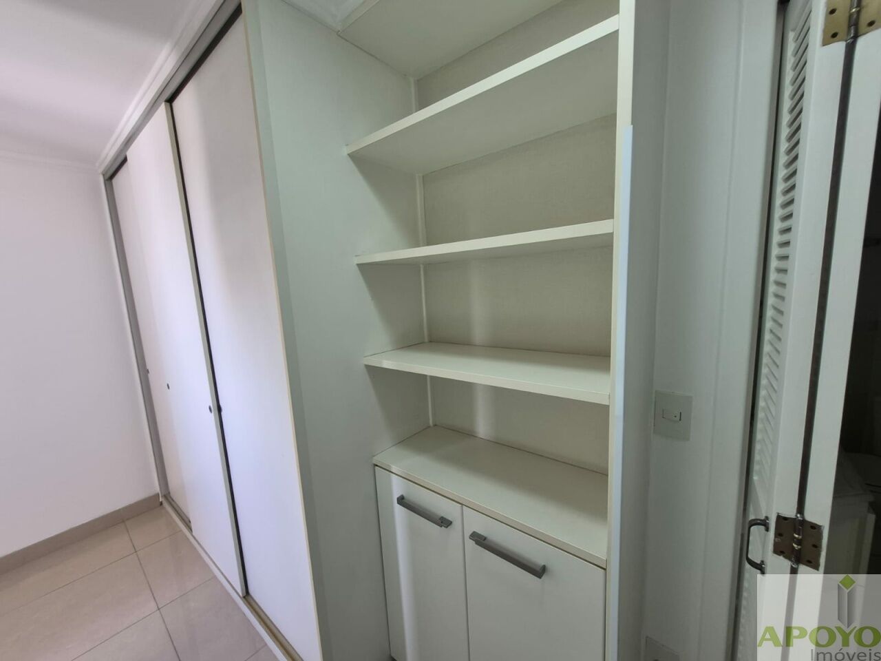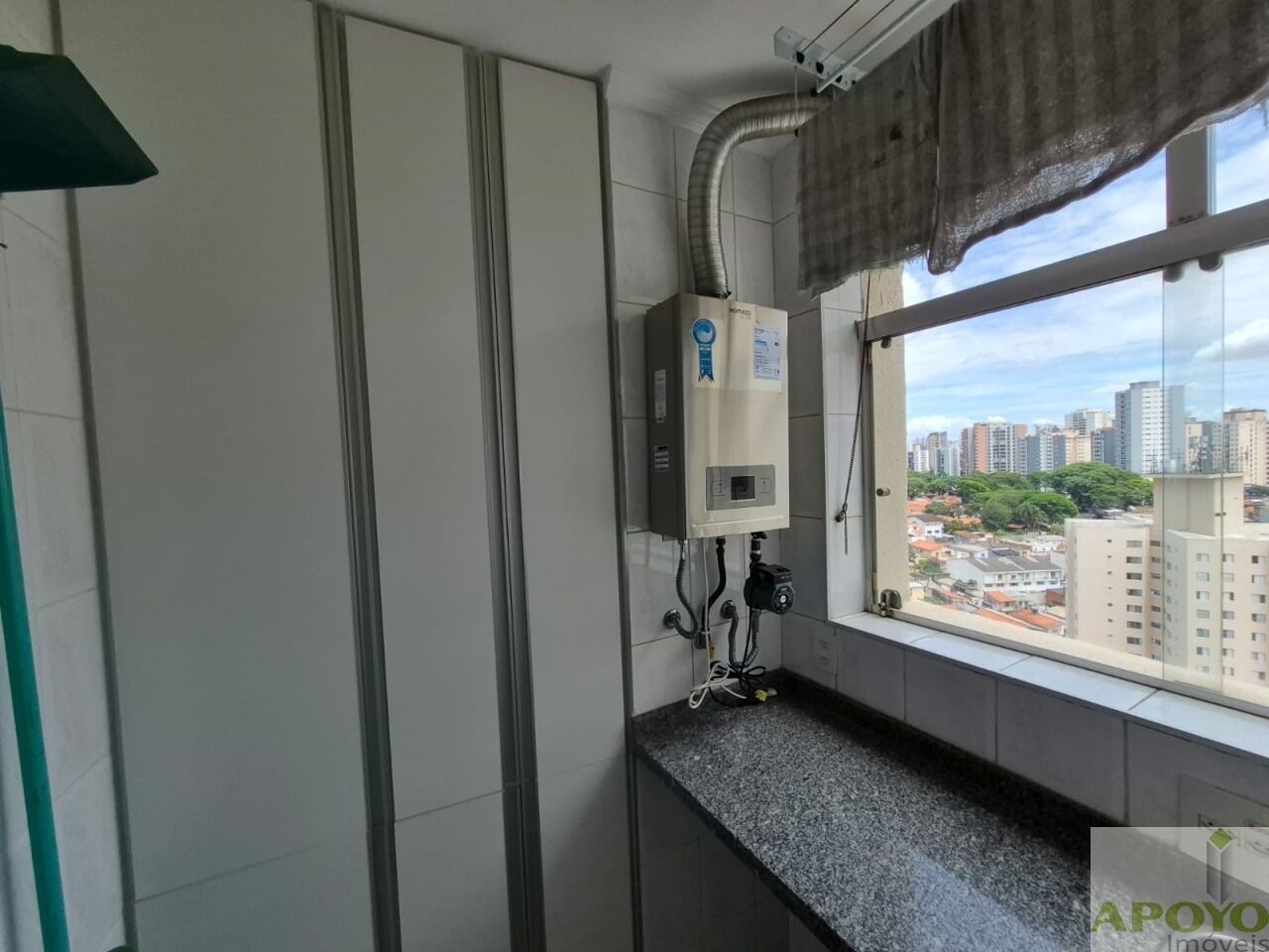 A cozinha é completa em armários, equipada com fogão e exaustor, além de área de serviço com armário e aquecedor.