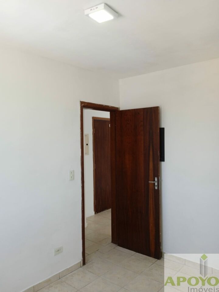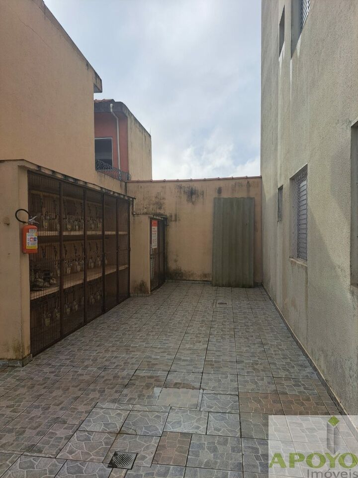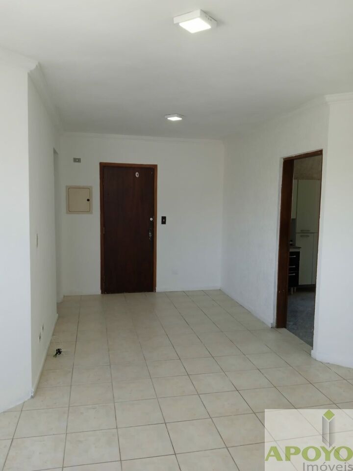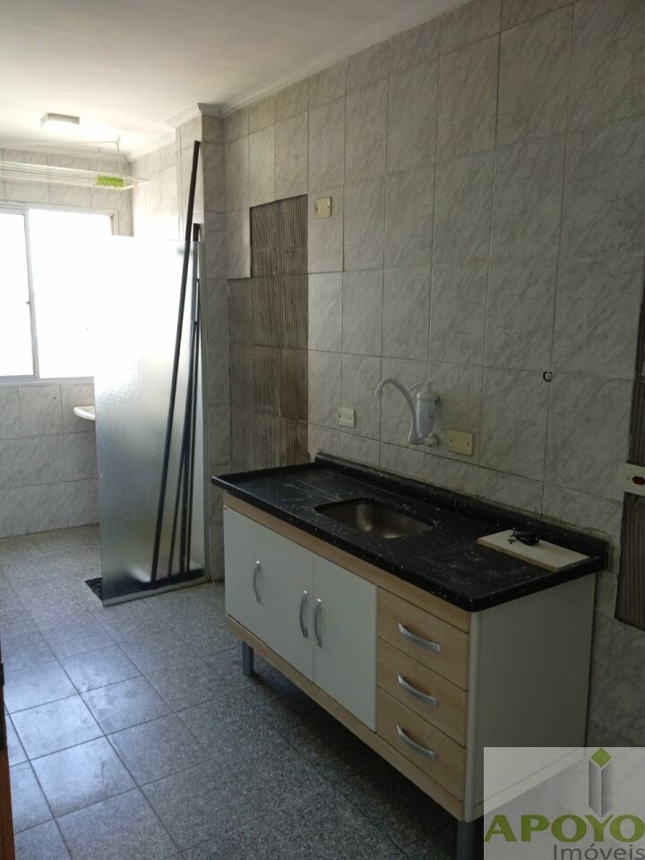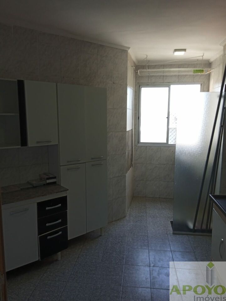Prédio sem elevador, apartamento com 2 dormitórios, sala ampla, cozinha com armários, área de serviço e 1 vaga na garagem.