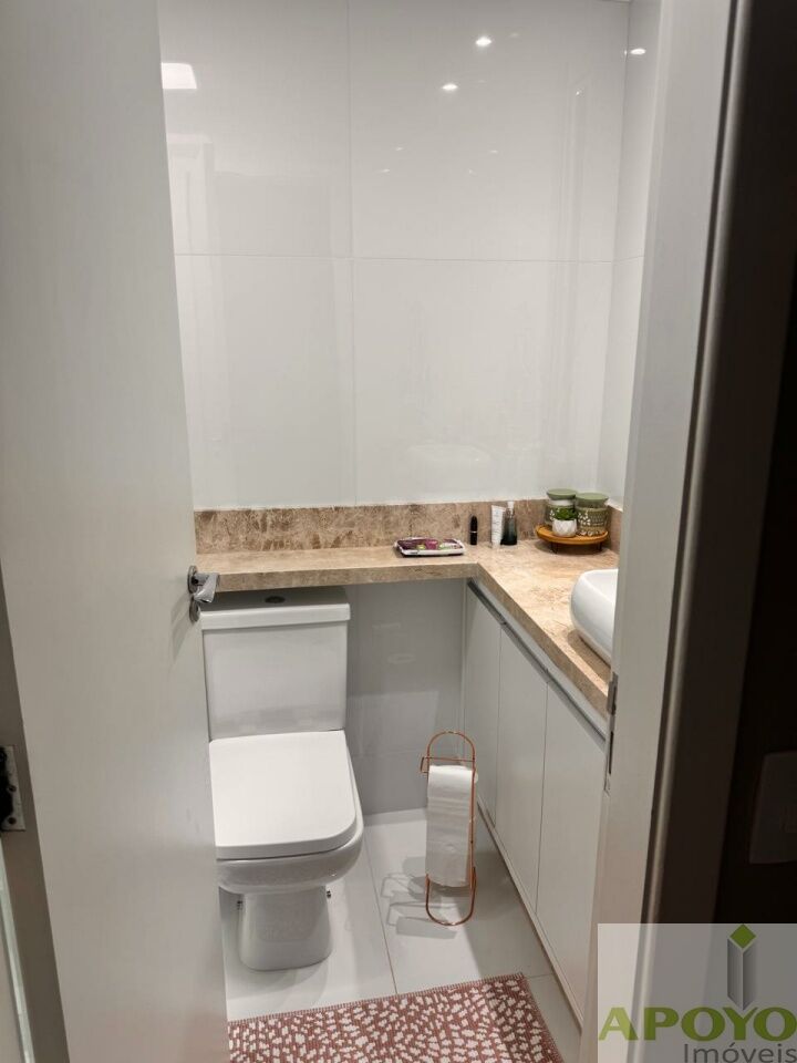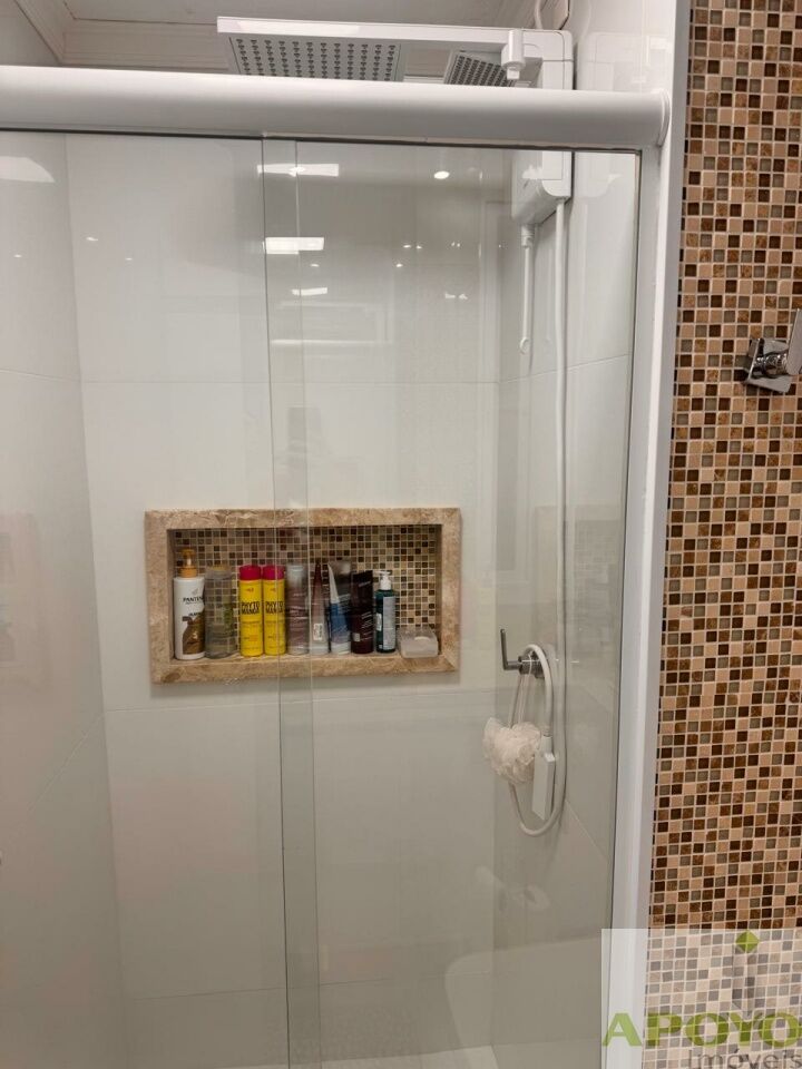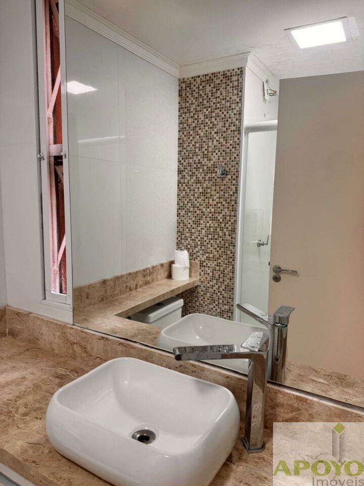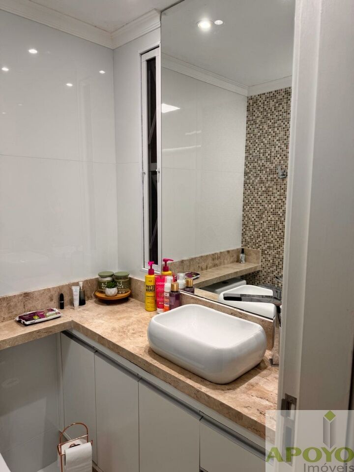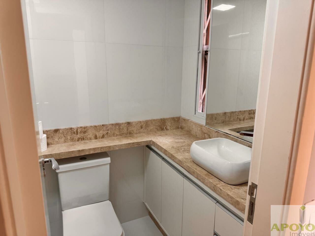 O banheiro social foi totalmente reformado, com bancada em mármore Crema Marfil, cuba de sobrepor, box de vidro e nicho embutido, unindo elegância e funcionalidade.