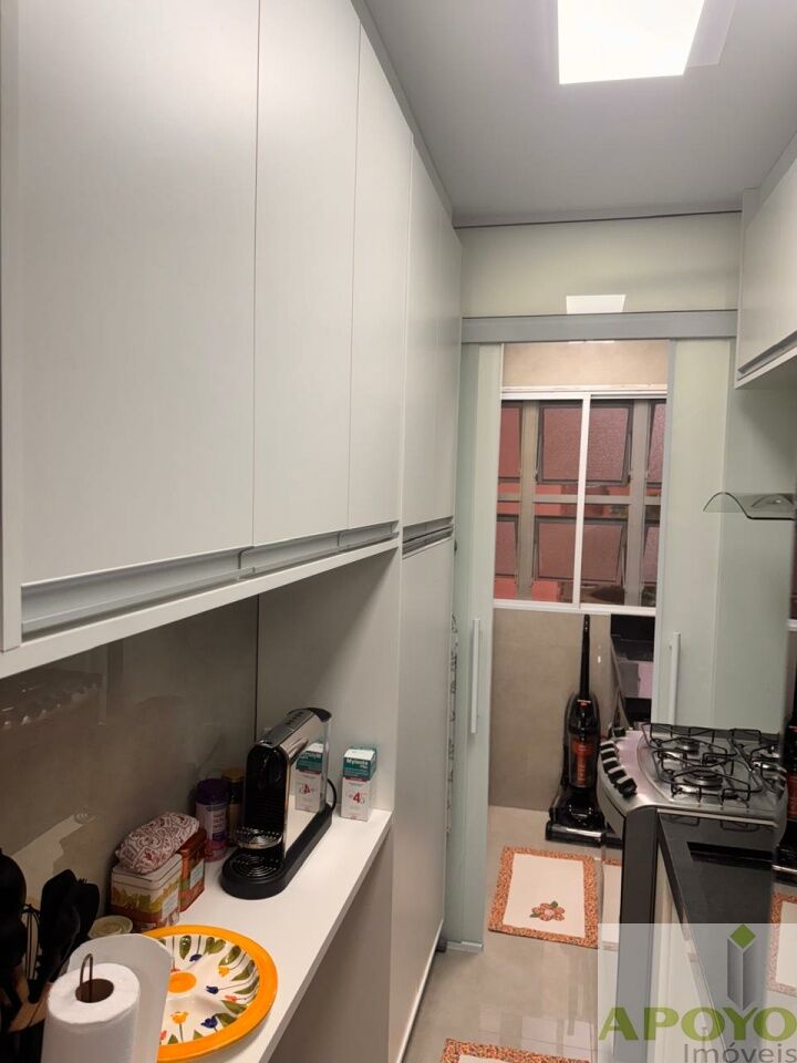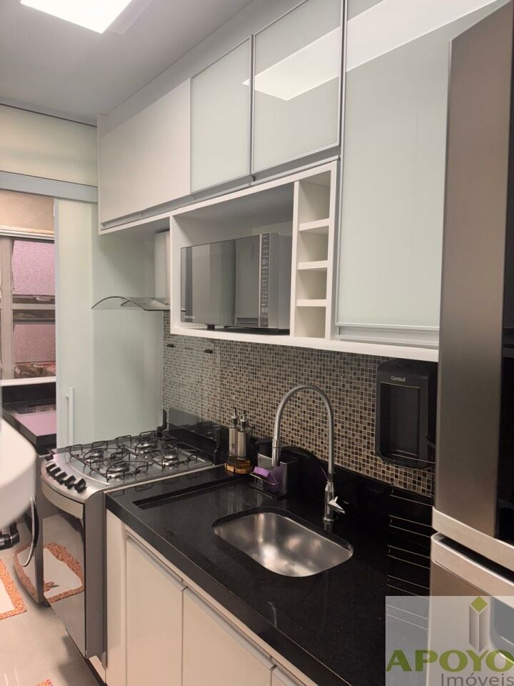A cozinha é repleta de armários planejados, aproveitando cada espaço de forma inteligente, além de contar com fogão embutido.