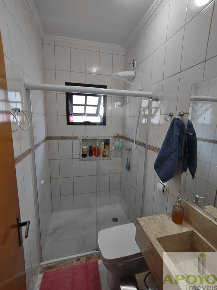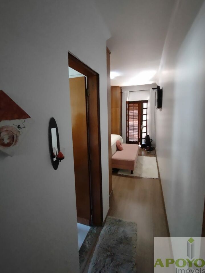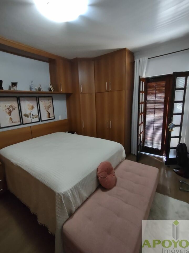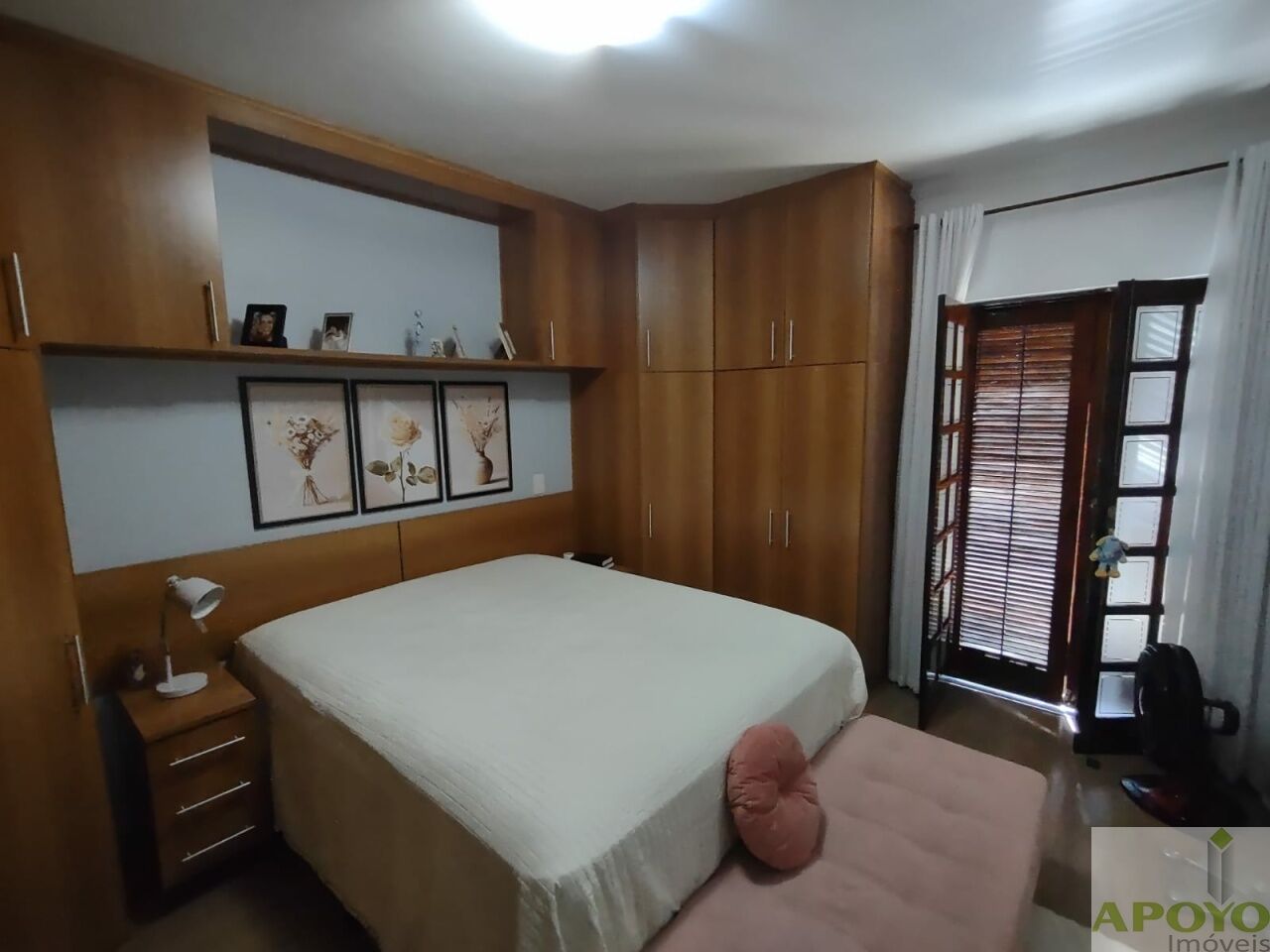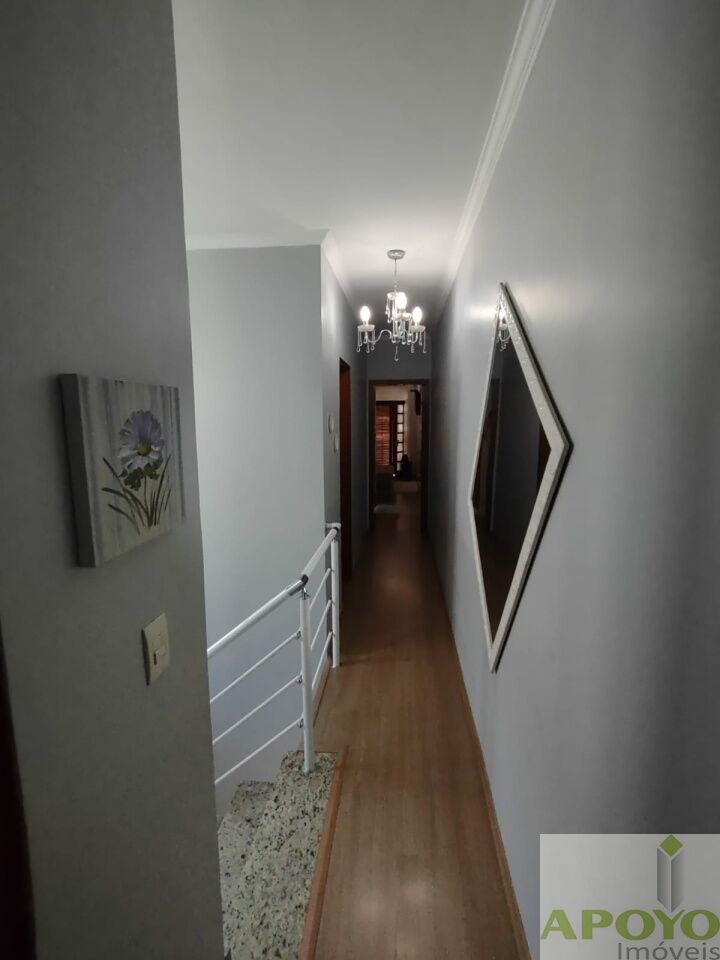 No pavimento superior, o imóvel conta com 3 dormitórios, sendo 1 suíte com sacada e armários planejados, além de um banheiro social que atende perfeitamente os demais quartos.