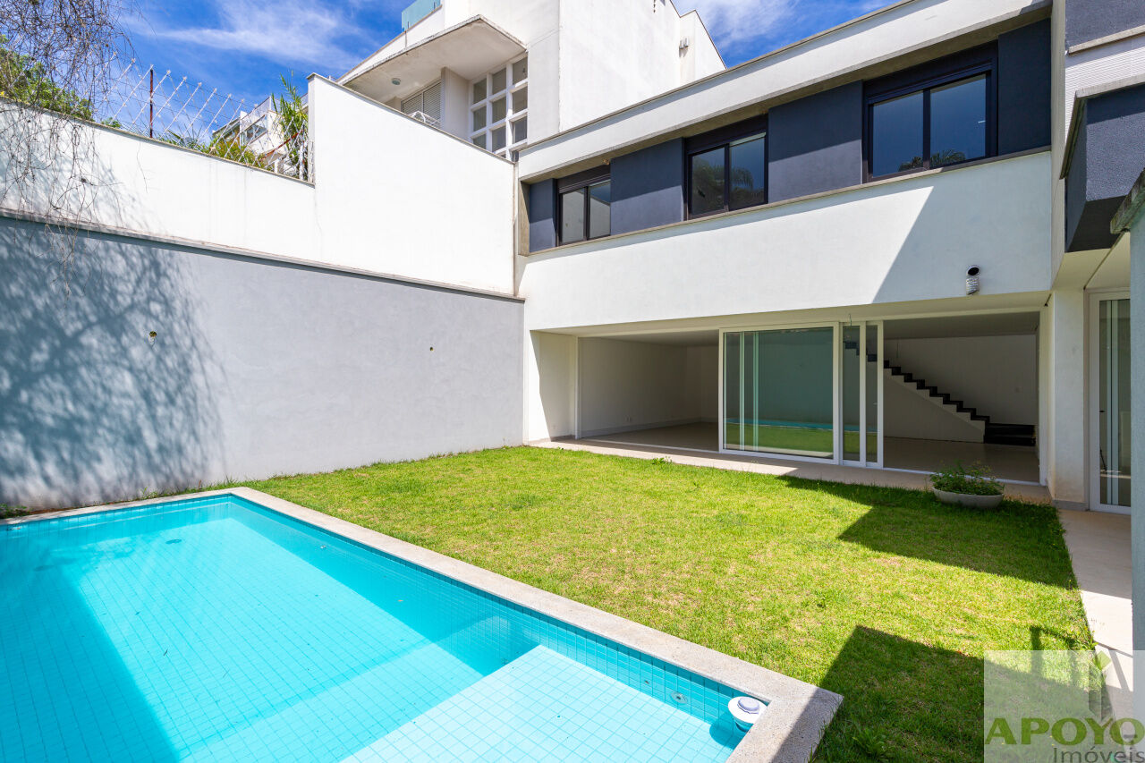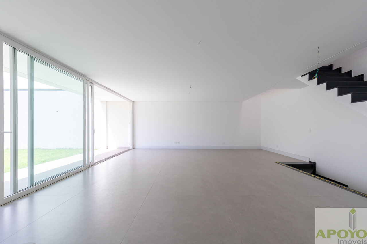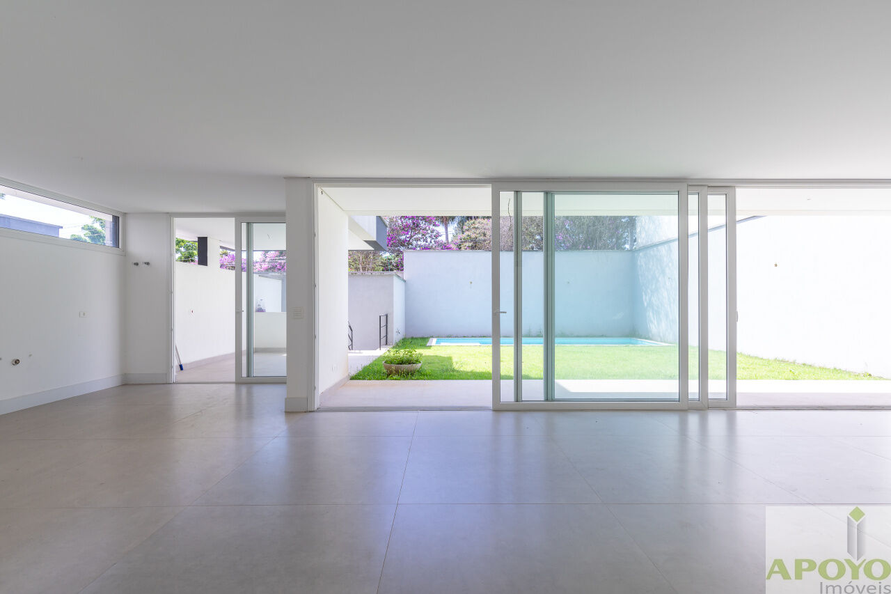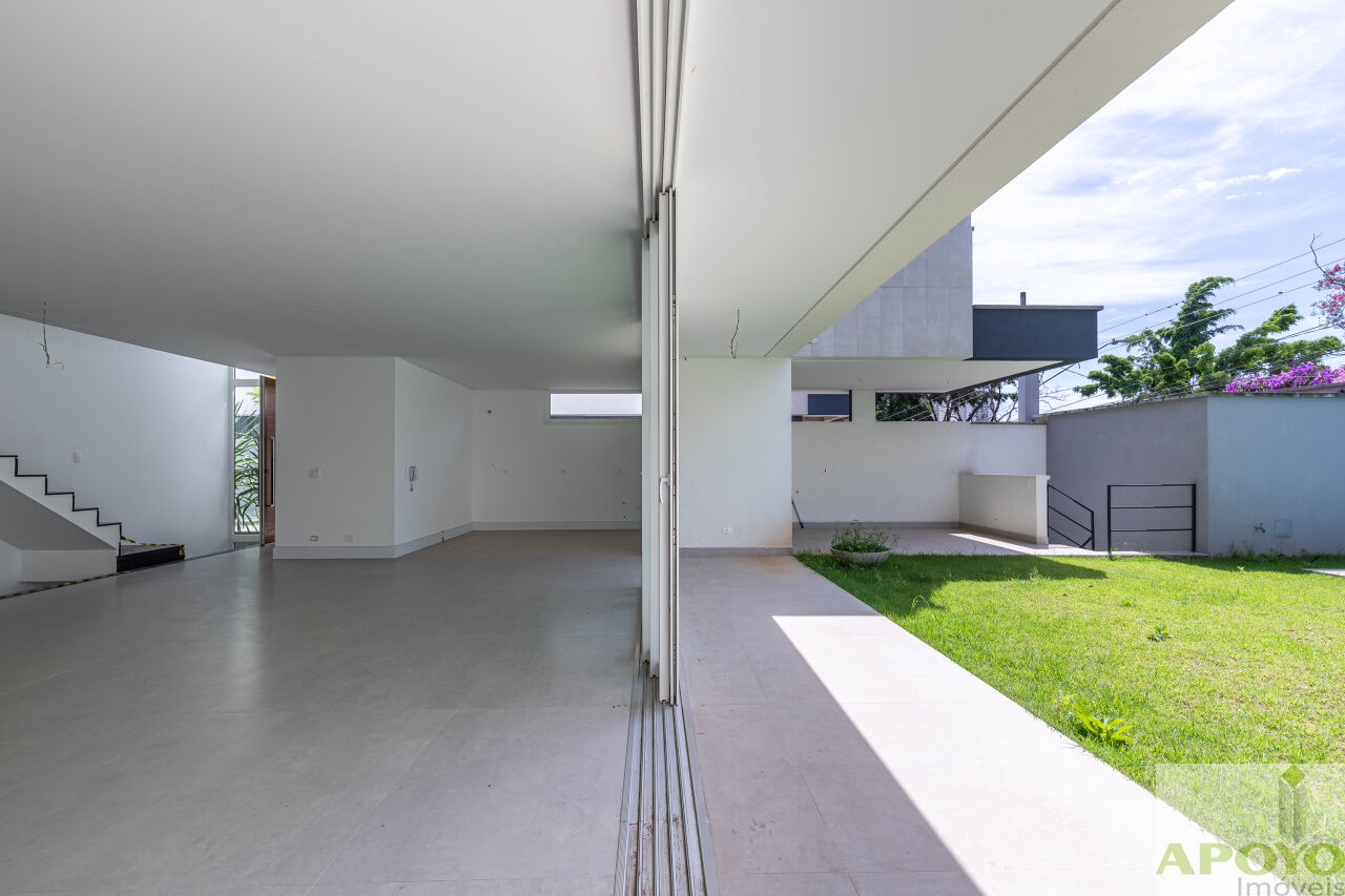 Casa com 4 suítes no segundo pavimento. Primeiro pavimento inteiramente aberto em ambientes que comporta, além da cozinha mais 3 ambientes e lavabo. Área externa com piscina, jardim gramado e área de serviço/lavanderia. 4 vagas de garagem no subsolo onde fica também uma dependência para empregados com banheiro – 427m² de área construida.