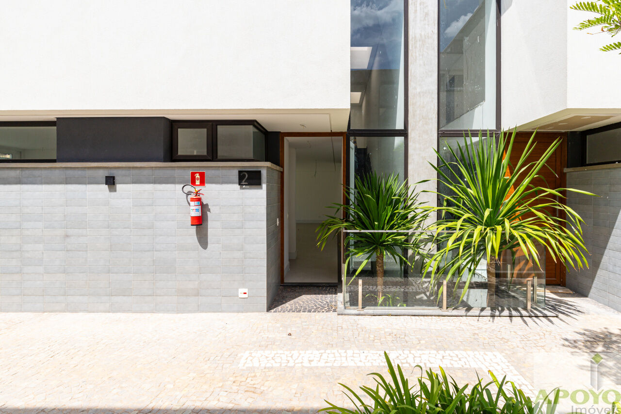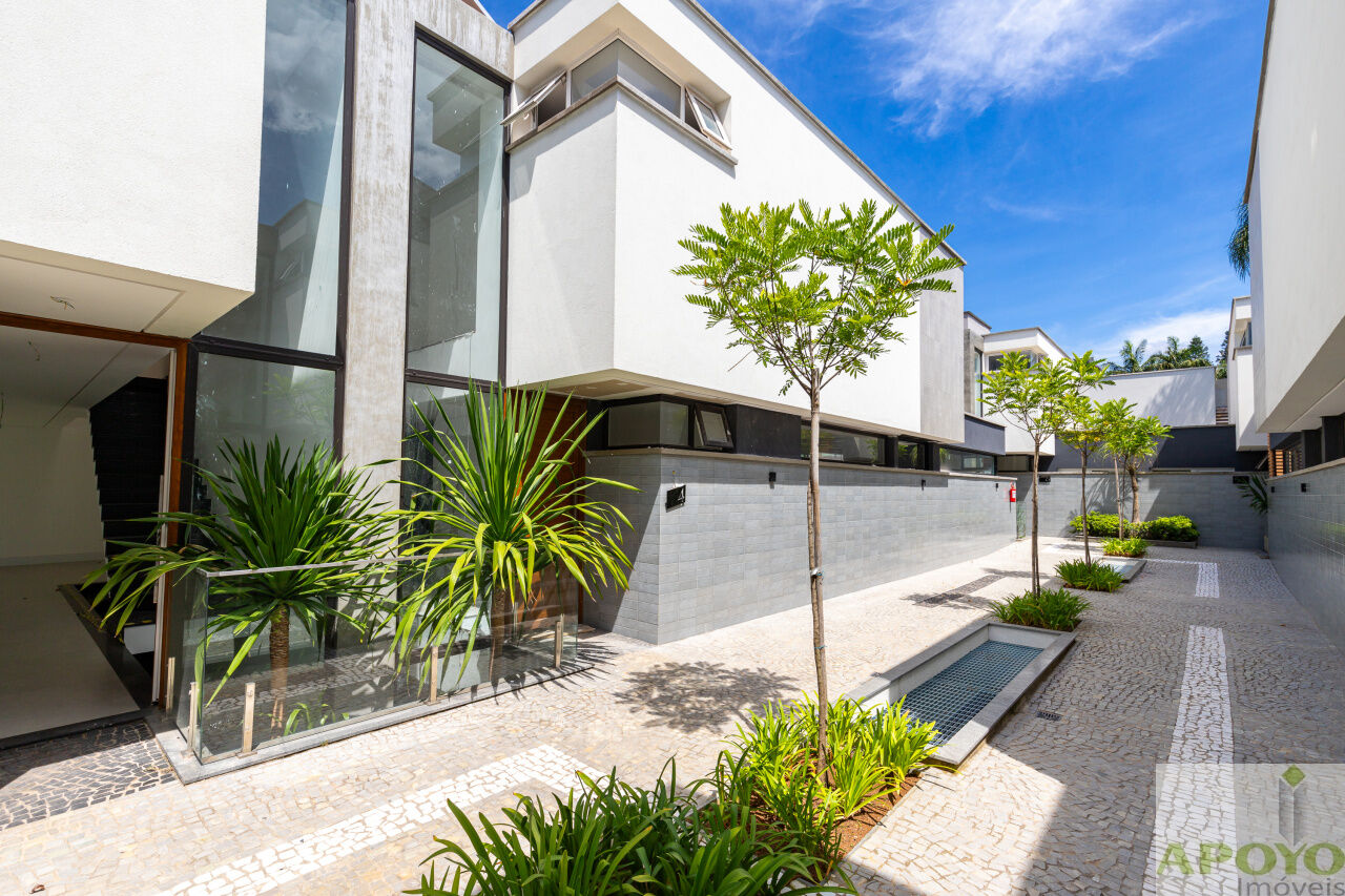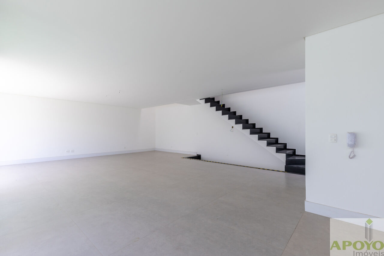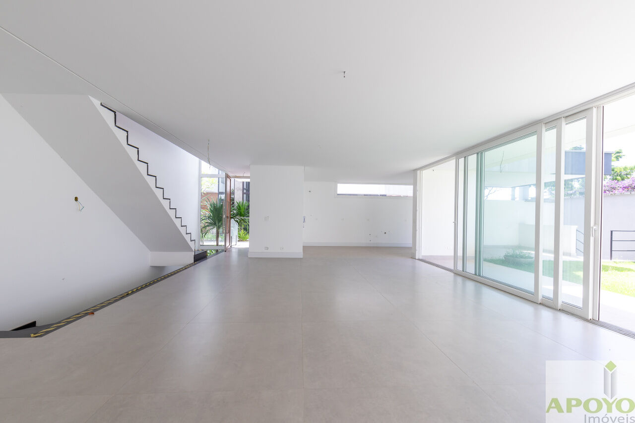 Casa com 4 suítes no segundo pavimento. Primeiro pavimento inteiramente aberto em ambientes que comporta, além da cozinha mais 3 ambientes e lavabo. Área externa com piscina, jardim gramado e área de serviço/lavanderia. 4 vagas de garagem no subsolo onde fica também uma dependência para empregados com banheiro – 427m² de área construida.