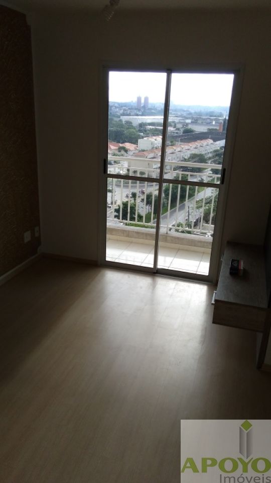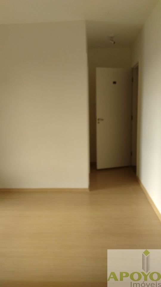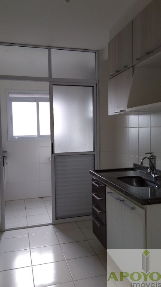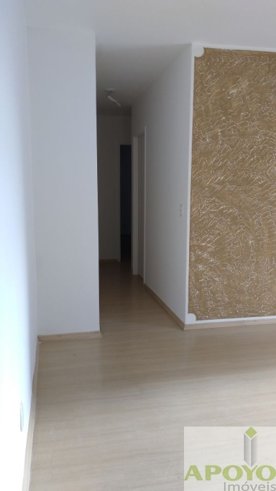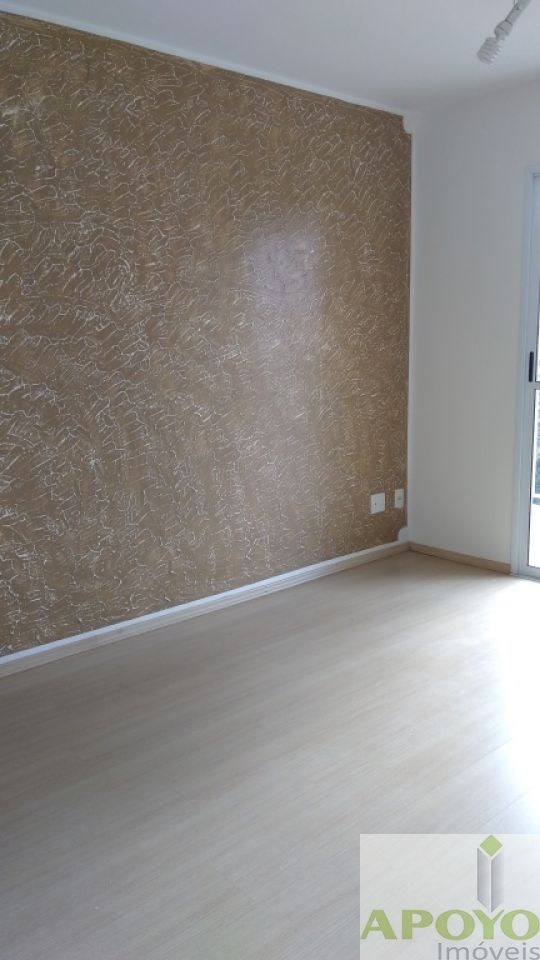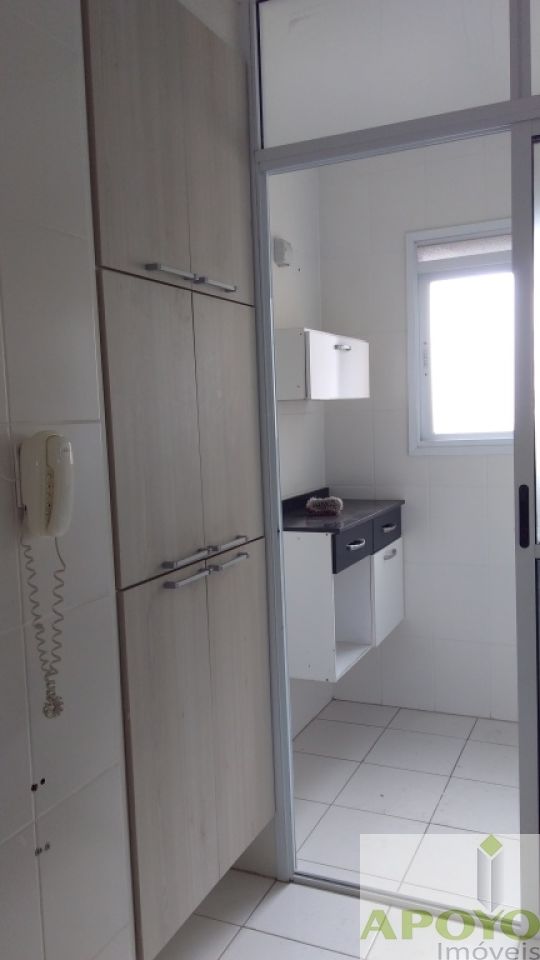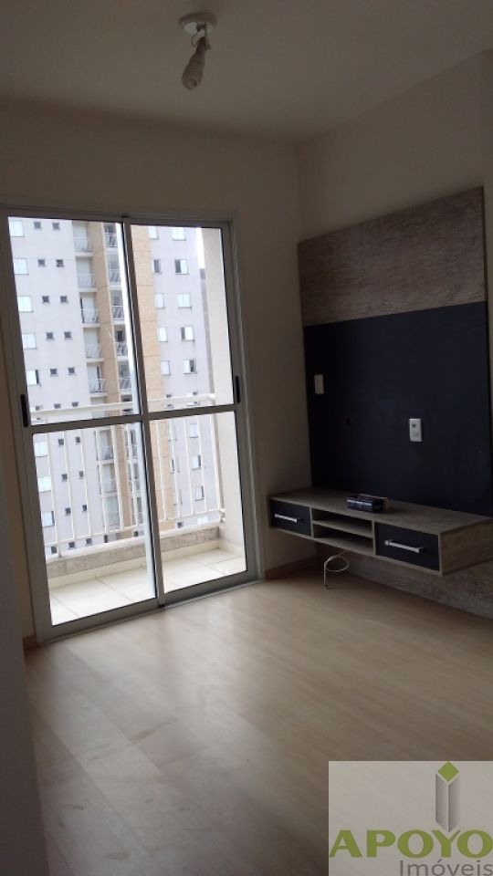 Ampla sala para dois ambientes com sacada, painel para tv, cozinha planejada com armários e área de serviço.