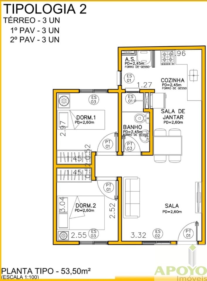 Apartamento com 54 metros quadrados 2 dormitórios com Sala e cozinha americana tudo Conjugado, lavanderia,